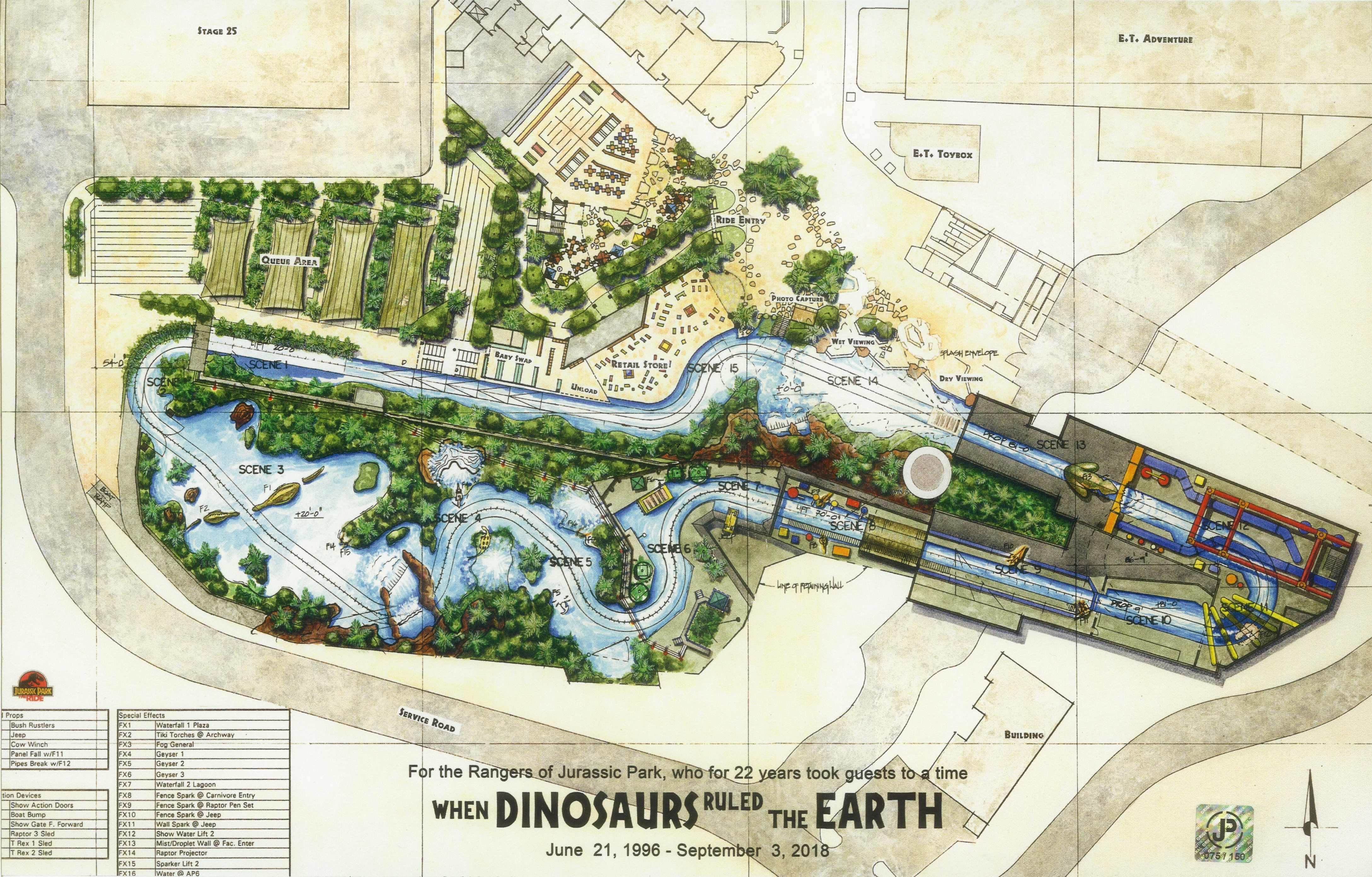 Gary Goddard: [...] The development of JURASSIC PARK: THE RIDE (which actually was called THE JURASSIC PARK RIVER ADVENTURE in our initial presentations) started very early, before the movie was even in production. I had already read the book prior to being asked to develop the concept, but as we got started, I was allowed to read the script to the Steven Spielberg movie, however, I had to read it at Amblin (Steven’s studio complex on the Universal lot), as no scripts were allowed out of studio. So I read it, along with a few key members of my staff, and it certainly triggered a number of ideas. We were VERY excited to start work on this.